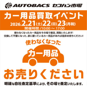 オートバックス海老名限定!2月21日(土)~23日(祝) カー用品買取イベント開催! 不要になったカー用品、ご自宅に眠っていませんか? 例えば、前に乗っていたおクルマ用の冬タイヤやタイヤチェーンなど。例えば、いつか使うかもと取っておいたけど、使う事が無いカー用品など...