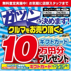 クルマを売ると最大10万円分のギフトカードプレゼント ■1月3日(土)から2月28日(土)まで実施 クルマを売るなら今がお得!買い取らせていただいた方に最大10万円分のギフトカードをプレゼントします。クルマを買い取らせていただいた方に...