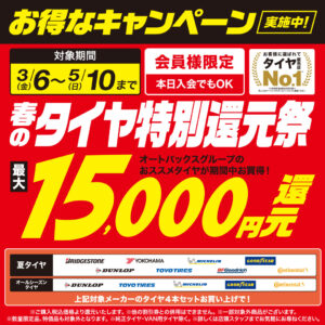 カーナビ最大7万円大還元祭!【2/20~5/10】 オートバックス会員様限定、カーナビ最大7万円(税込)大還元祭を実施いたします。 対象期間2026年2月20日(金)~5月10日(日) オートバックス会員様【入会金・年会費無料/当日...